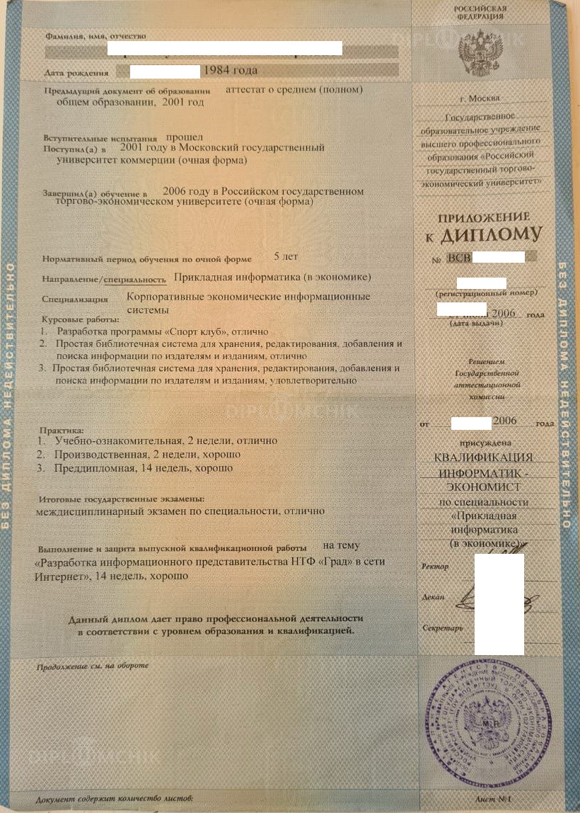 Дипломчик изготавливает приложения к дипломам о высшем, среднем, начальном профессиональном образовании или к аттестатам, дипломам курсов, повышения квалификации, о профессиональной переподготовке любых годов. Присылайте скан вашего диплома и приложения (если есть) и мы сделаем всё как надо.